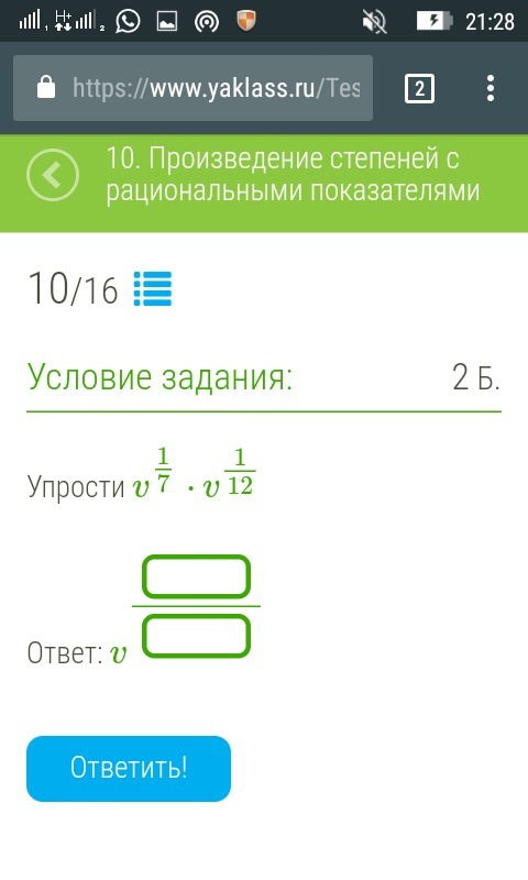 v^{ frac{1}{7} }* v^{ frac{1}{12} }  = v^{ frac{1 ^{(12} }{7}+ frac{1 ^{(7} }{12}  } = v^{ frac{12+7}{84} } = v^{ frac{19}{84} }