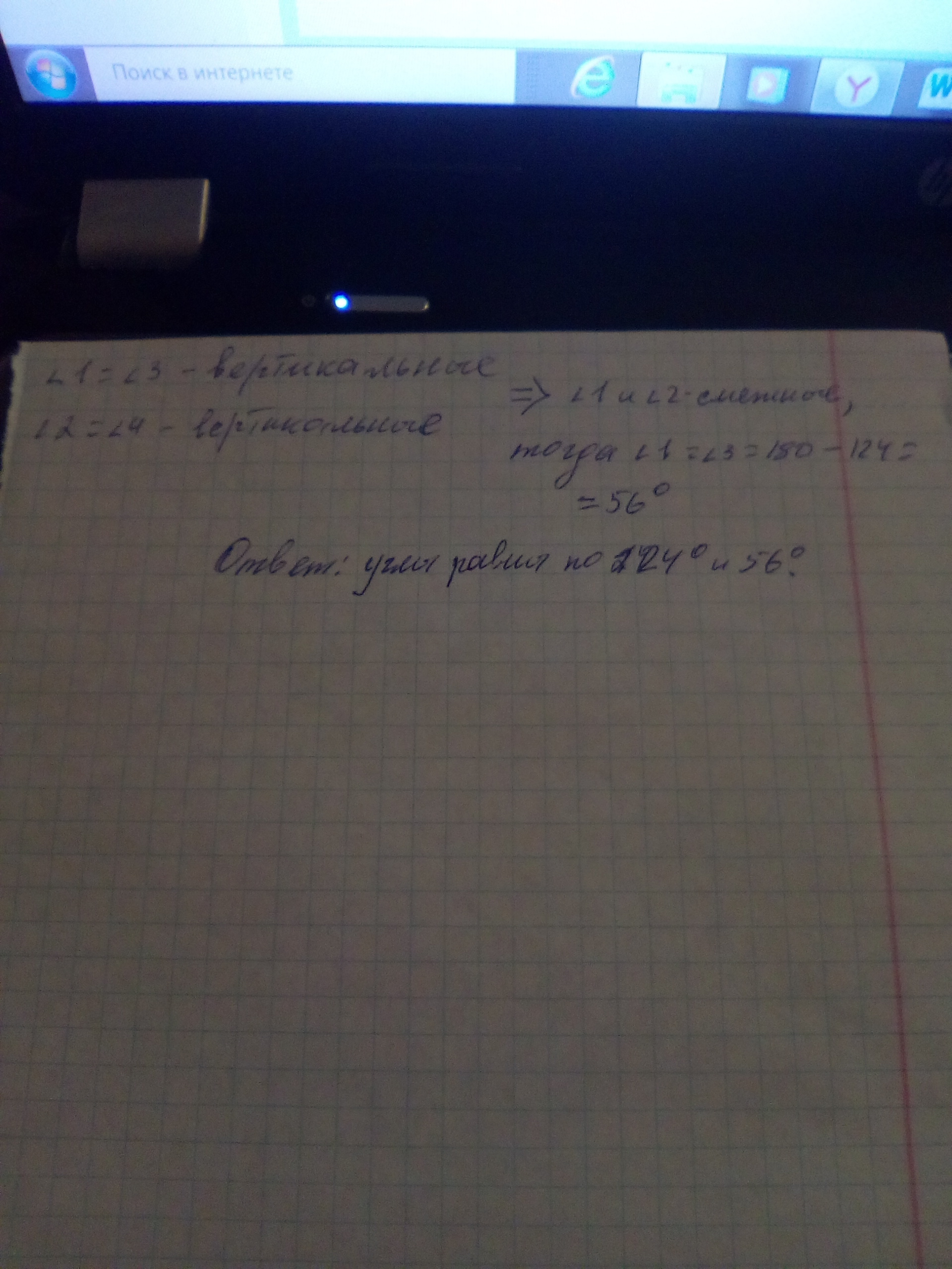 Один из углов образованный при пересечении двух приямых равен 124градуса .Найдите градусные меры остальных углов