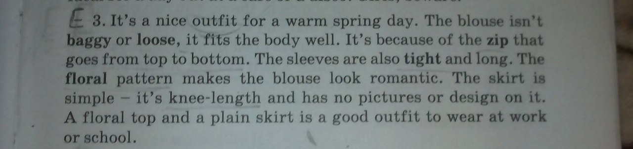 Это прекрасна одежда для теплого весеннего денька. Блуза не мешковатая и не свободная. Она отлично сидит на теле. Все это из за молнии (застежки) которая проходит с верху вниз. Рукава также тонкие и длинные. Узоры в виде цветков придает блузке романтический оттенок. Юбка простая- длинная до колен без какого-то дизайна на ней. Узорчитая кофта и строгая юбка-хорошая одежда для работы или школы