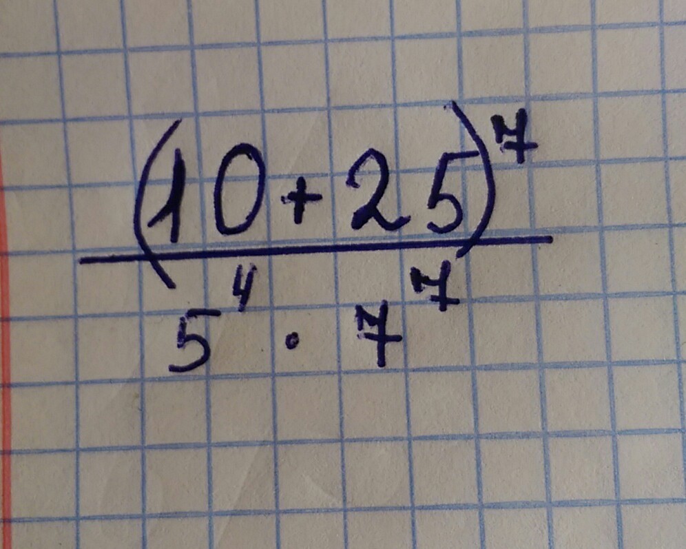 Смотри, 10 + 25 = 35,а это можно расписать как (5*7)7 Т.к у нас это все заключено в скобках,то воспользуемся свойством степени,и получится