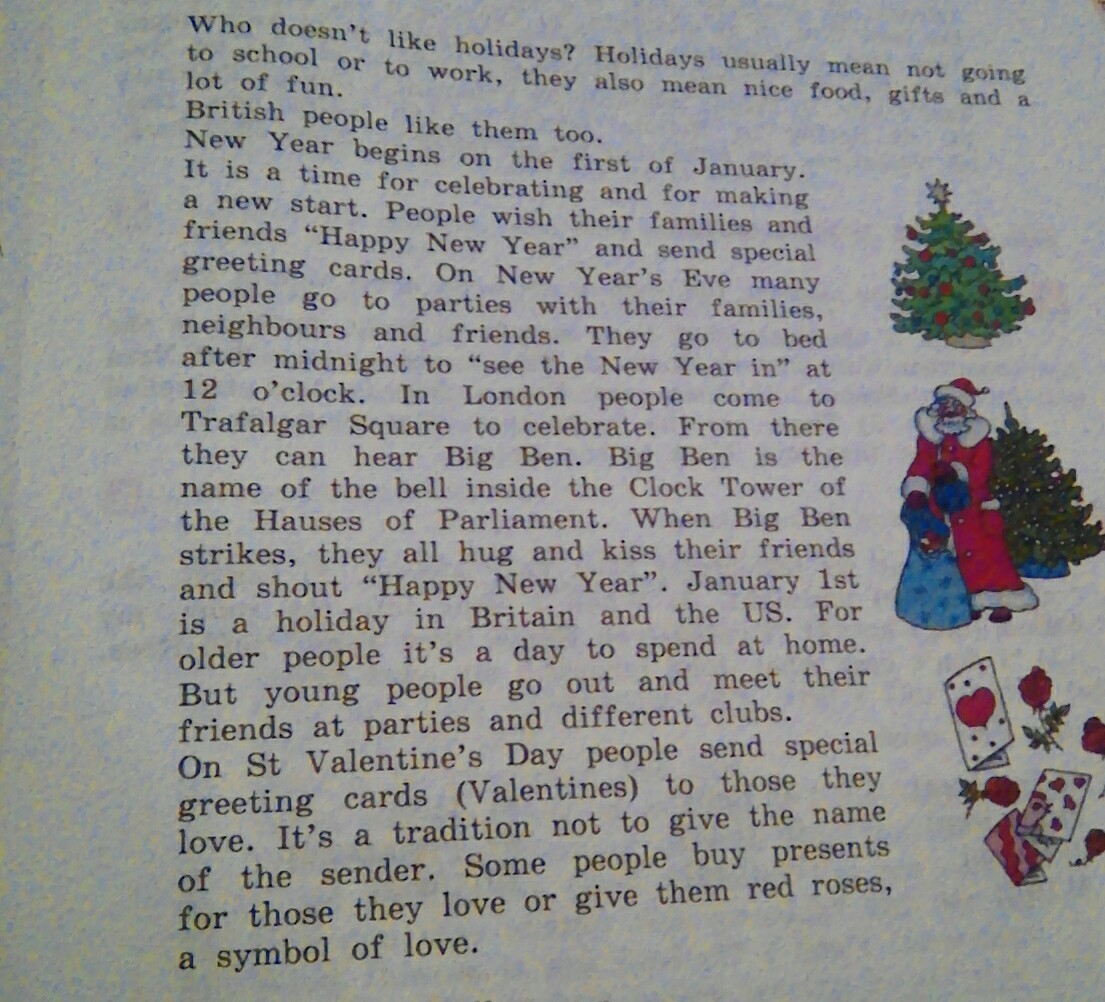 Новый год начинается с первого января.Это время для того чтобы праздновать и начать все с чистого листа.Люди позравляют семью и друзей "С Новым Годом!" и отправляют специальные поздравительные открытки.В канун Нового Года многие ходят на вечеринки со своими семьми,соседями и друзьями.Они идут спать после полуночи чтобы встретить Новый Год в 12 часов.В Лондоне люди идут праздновать на Трафальгарскую площадь.От туда они могут слышать Биг-бен.Биг-бен это название колоколв внутри Часовой Башни Домов Парламента.Когда Биг-бен звенит,они все обнимаются и целуют своих друзей и кричат "С Новым Годом!".Первое января это праздник для Британии и США.Для пожилых это день сидения дома.Но молодые люди выходят на улицу и встречаются с друзьями на вечеринках и в различных клубах.