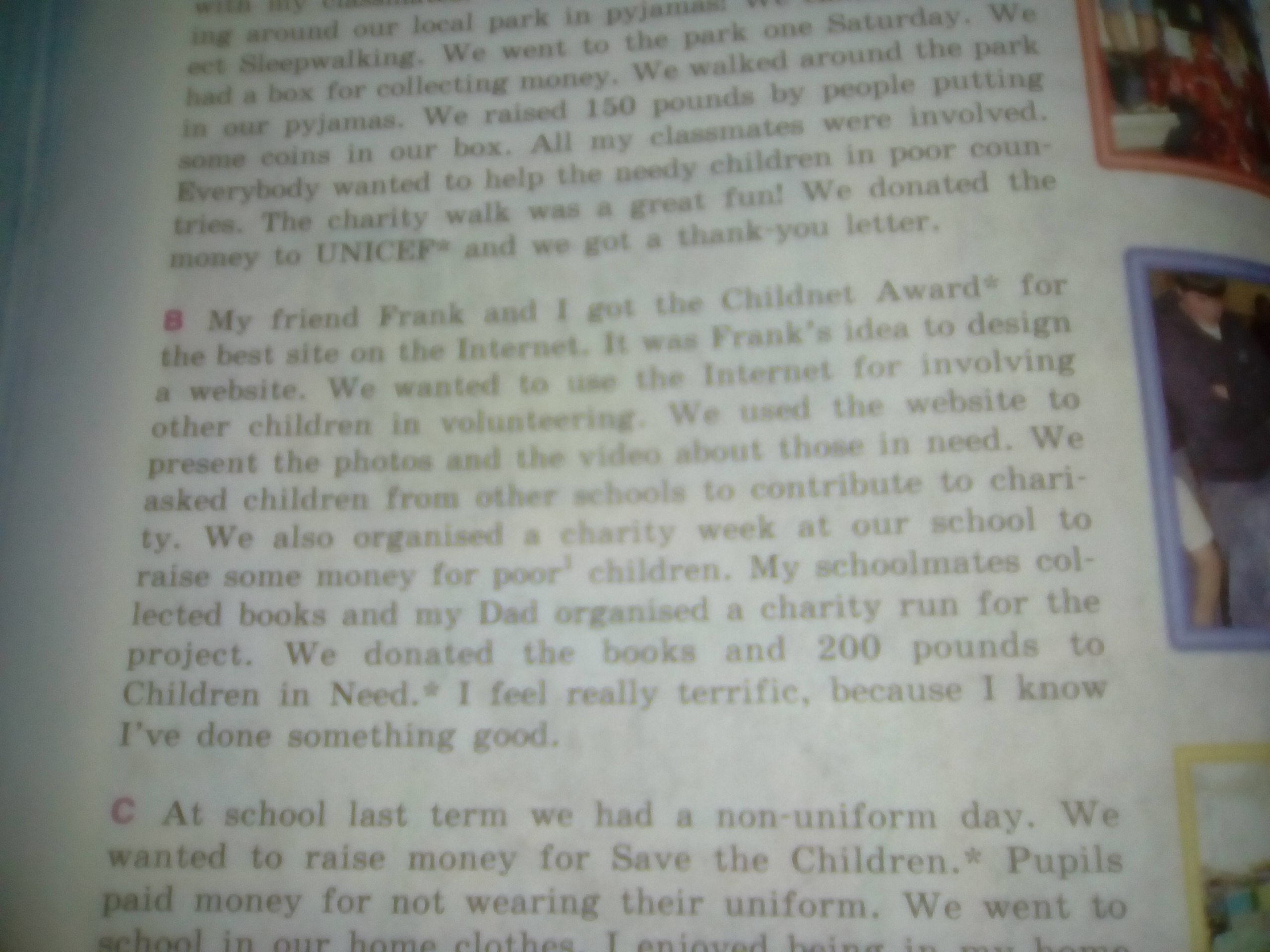 мой друг и я получили childnet награду за лучший сайт на просторах Интернета.это была идея Френка , создать сайт. мы хотели с помощью интернета вовлечь других детей в волонтерство. на сайте мы показывали видео и фото нуждающихся людей.детей из других школ мы попросили посодействовать для благотворительности. также мы организовали неделю сбора денег для бедных детей в нашей школе. мои одноклассники собрали книги ,а отец организовал благотворительный забег.мы отдали книги и 200 паундов с забега детям в нужде.я чувствую себя взволнованным ,так как знаю ,что сделал что то хорошее