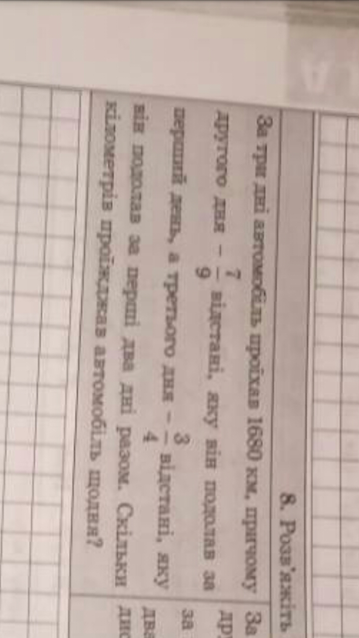 ДАЮ 42 БАЛЛА!Алгебра, 7 класс. Задача на фото и тут: За три дня автомобиль проехал 1680 км, причем во второй день 7/9 расстояния, которого он одолел за первый день, а в третий день 3/4 расстояния, которого он одолел за первые 2 дня вместе.Сколько км проезжал автомобиль наждый день?Заранее огромное спасибо за подробный ответ!