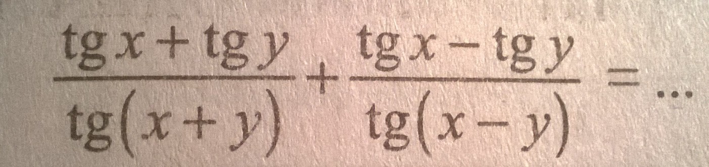 frac{tgx+tgy}{tg(x+y)}+frac{tgx-tgy}{tg(x-y)}=frac{tgx+tgy}{frac{tgx+tgy}{1-tgxcdot tgy}}+frac{tgx-tgy}{frac{tgx-tgy}{1+tgxcdot tgy}} =\\= 1-tgxcdot tgy+1+tgxcdot tgy=2\\\P.S.; ; ;  frac{a}{ frac{b}{c} } = frac{ac}{b}
