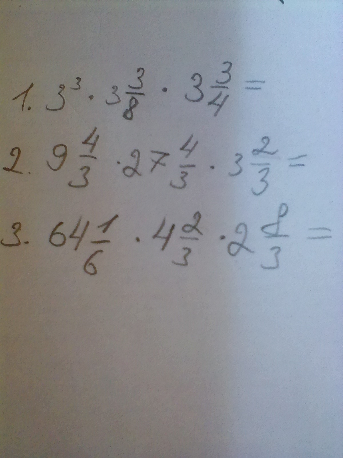Тогда мы все дроби делаем неправильными, и получаем выражение 27/1 * 27/8 * 15/4 = 729/8 * 15/4 = 341 23/32