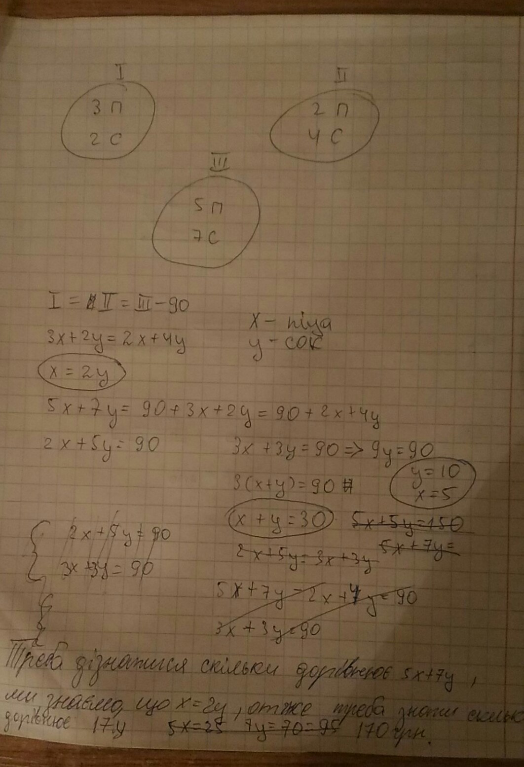 У ПІЦЕРІЇ ЗА ПЕРШИМ СТОЛИКОМ ЗАМОВИЛИ 3 ПІЦИ ТА 2 СОКА, ЗА ДРУГИМ СТОЛИКОМ - 2 ПІЦИ І 4 СОКА, А ЗА ТРЕТІМ - 5 ПІЦ І 7 СКЛЯНОК СОКУ. УСІ ЗАМОВЛЕННІ ПІЦИ І СОКИ ОДНАКОВІ. ГОСТІ ЗА ПЕРШИМ СТОЛИКОМ ТА ЗА ДРУГИМ ЗАПЛАТИЛИ ОДНАКОВУ СУМУ ГРОШЕЙ, АЛЕ НА 90 ГРН МЕНШЕ НІЖ ГОСТІ ЗА ТРЕТІМ СТОЛИКОМ. СКІЛЬКИ ГРИВЕНЬ ЗАПЛАТИЛИ ЗА ТРЕТІМ СТОЛИКОМ?