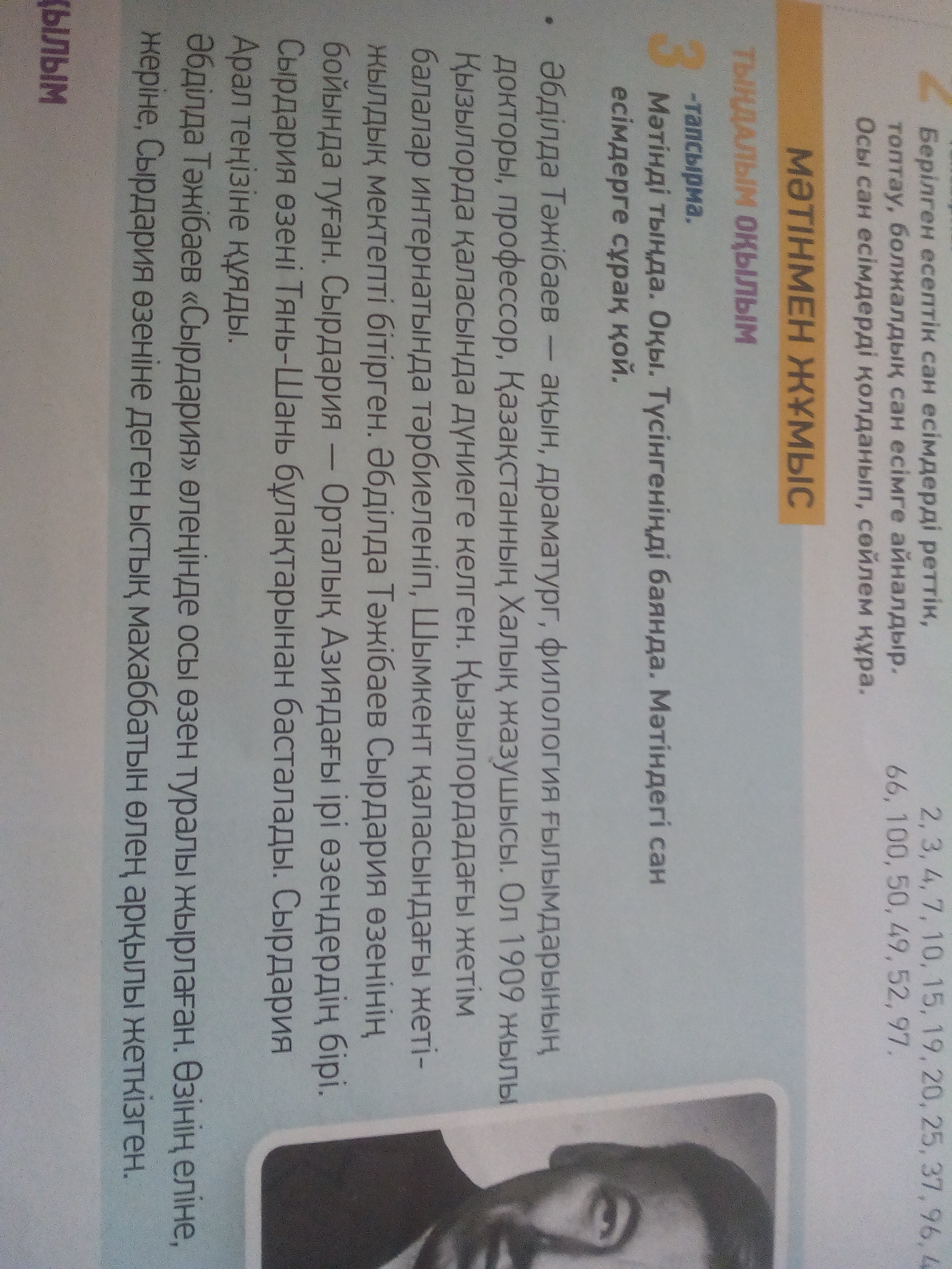 Абдылда Тажыбаев- поэт, драматург, доктор, профессор, Казахстанский народный писатель. Он родился в 1909 году в городе Кызылорде. После того как он выучился в интернате, он закончил школу в Шымкенте. В центральной Азии- Сырдария одно большое озеро. Озеро Сырдария начинается с Тянь-Шаня. И втекает в море Арал.
