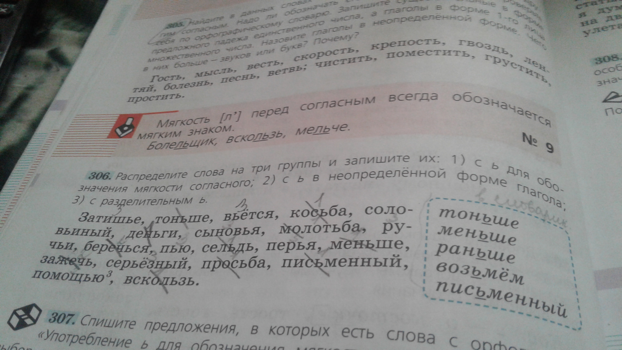 1) Тоньше, косьба, деньги, молотьба, сельдь, меньше, просьба, письменный, вскользь.