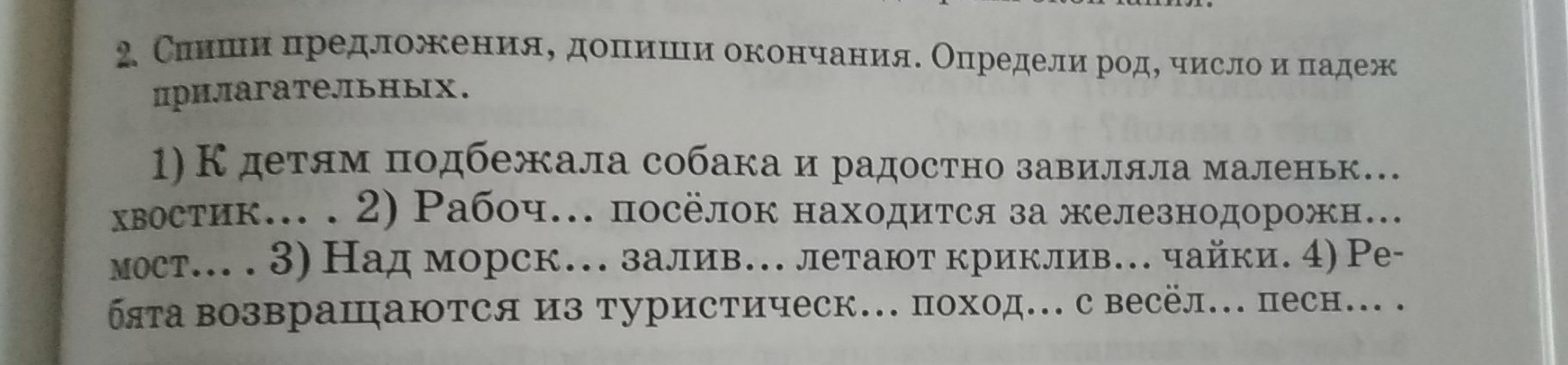 МаленькИМ хвостикОМ-м.р., Т.П., ед.ч., рабочИЙ посёлок-м.р., И.П., ед.ч., за железнодорожнЫМ мостОМ-м.р., Т.П., ед.ч., над морскИМ заливОМ-м.р., Т.П., ед.ч., крикливЫЕ чайки-ж.р., И.П., мн.ч., из туристическОГО походА-м.р., Р.П., ед.ч., с весёлЫМИ песнЯМИ-ж.р., Т.П., мн.ч.