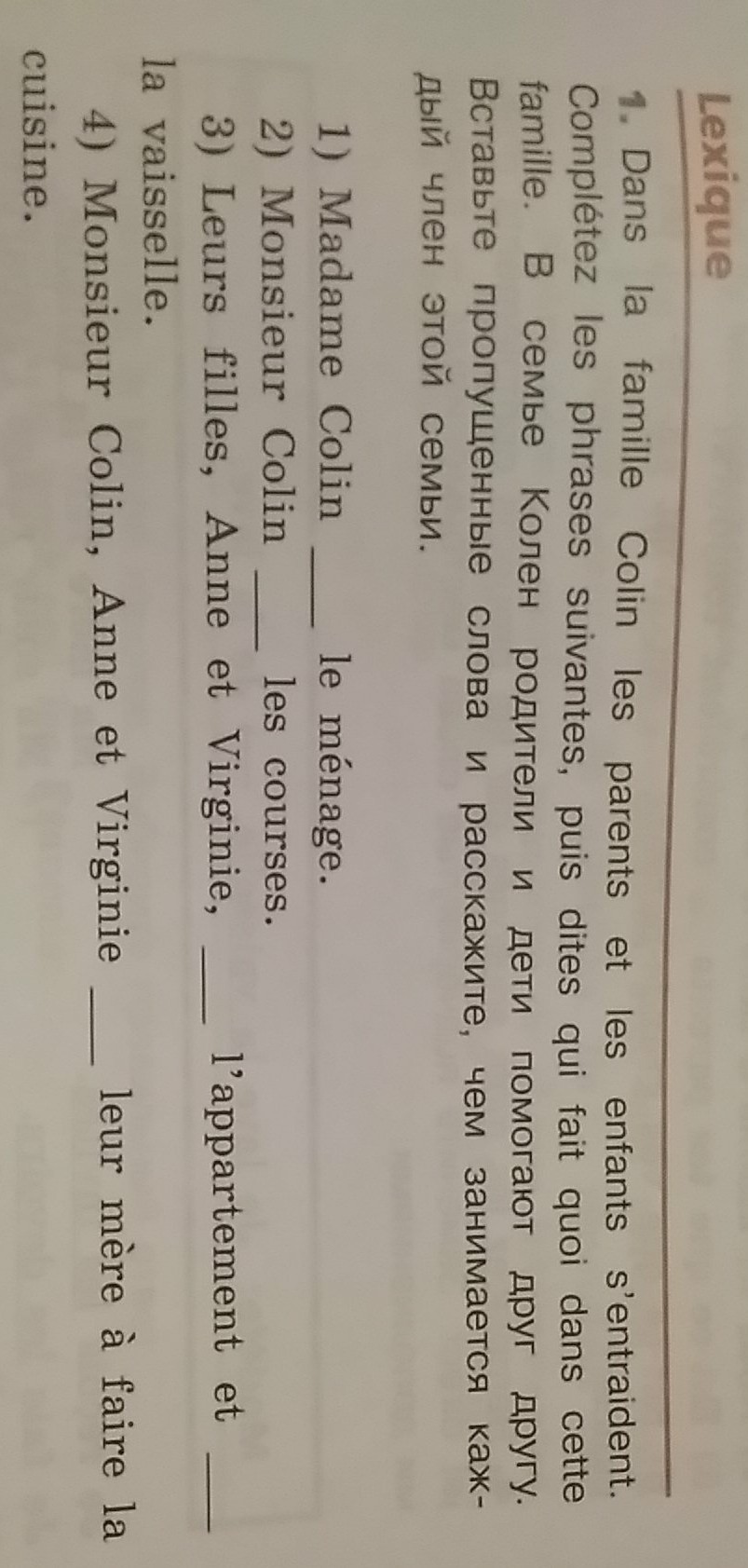 В семье Колен родители и дети помогают друг другу. Вставьте пропущенные слова и расскажите,чем занимается каждый член этой семьи. Помогите пожалуйста!