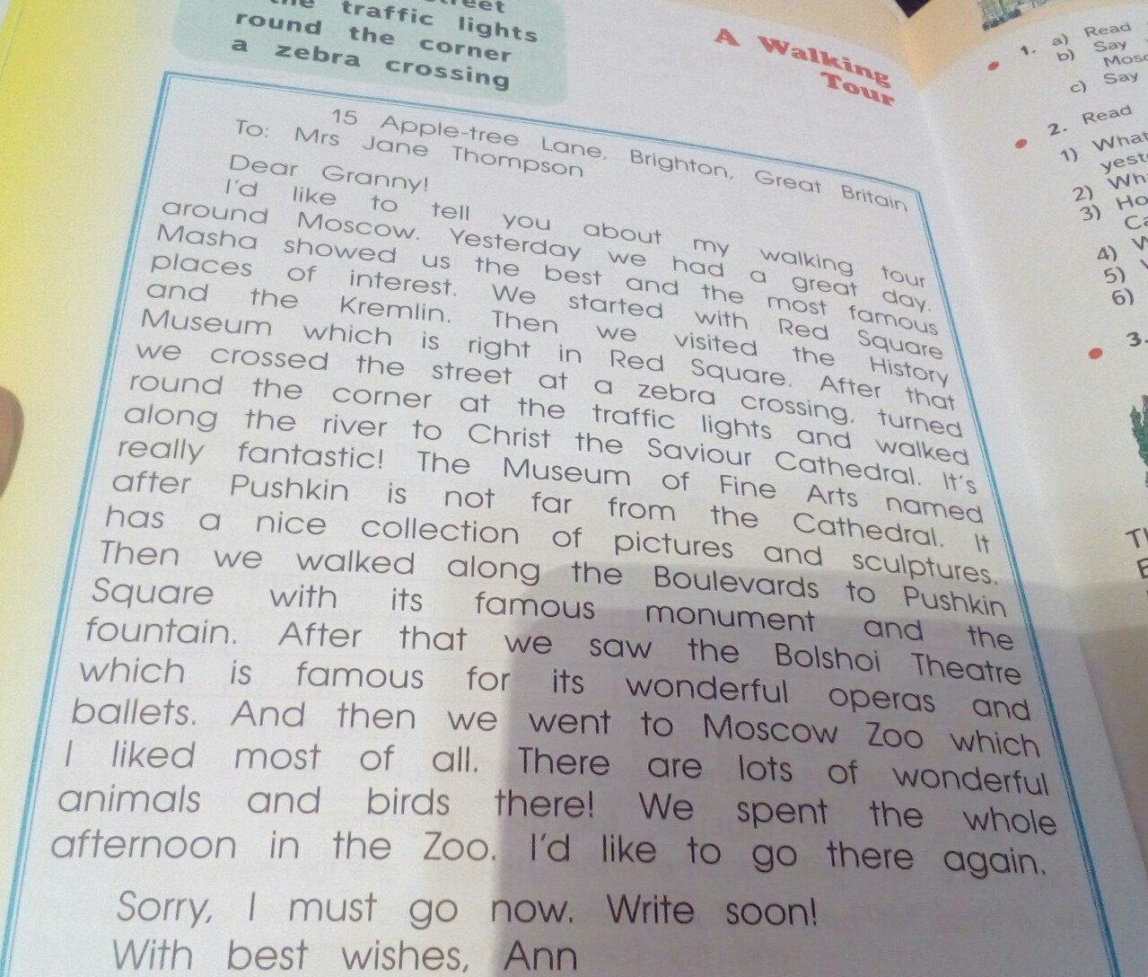 дорогая бабушка, мне бы хотелось рассказать тебе о о моем туре вокруг Москвы. Вчера у нас был замечательный день Маша показала нам лучшие и самые известные достопримечательности. Мы начали с Красной площади и Кремля. Затем мы посетили исторический музей который справа на Красной площади. После этого мы перешли улицу по зебре, повернули вокруг на углу и прошли вдоль реки ( она так и называется). Это было по настоящему замечательно. Музей веселого рисования упомянутый после Пушкина не очень дальний из собора. Это была замечательная коллекция картин и скульптур. затем прошли вдоль бульвара пушкина площадь со знаменитыми монументами и фонтанами. затем мы увидели "большой театр" который знаменит лучшими операми и балетами и затем мы пошли в московский зоопарк который мне понравился больше всего. здесь было множество замечательных животных и птиц здесь. мы провели лучший полдень.
