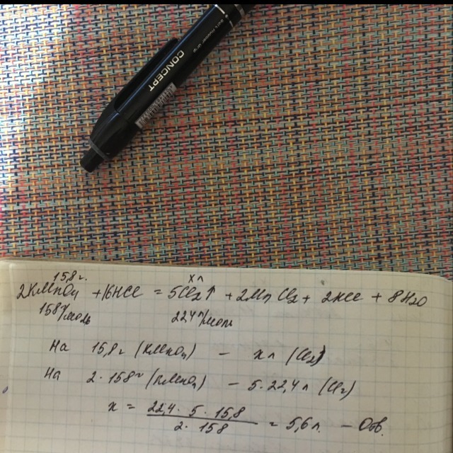 Вычислить объем хлора, который образуется при окислении соляной кислоты с 15,8 г перманганатом калия .
