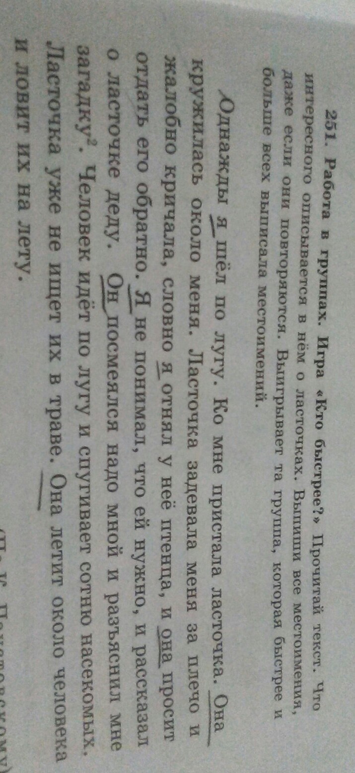 работа в парах игра Кто быстрее Прочитай текст что интересно описывается в нём о ласточках Выпиши все местоимения даже если они повторяют выигрывает так группа которая быстрее больше всех выписала местоимений