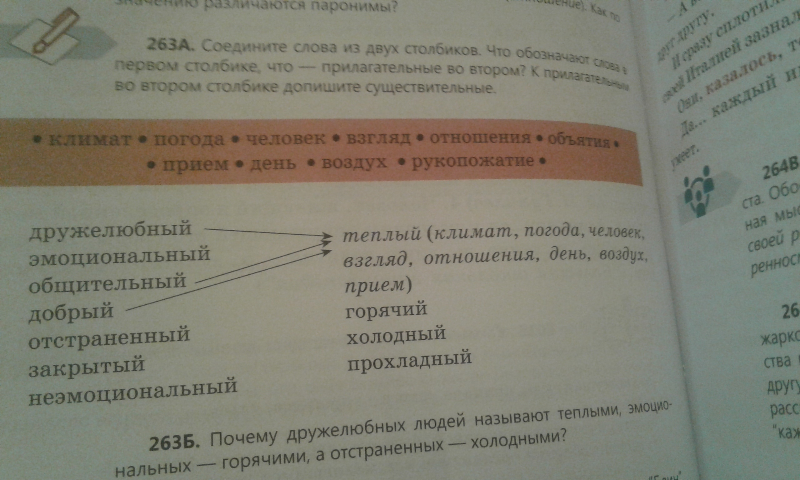 Во 2 столбике дружелюбный, эмоциональный , общительный , добрый , отстраненный, закрытый, неэмоциональный, тёплый , горячий, холодный, прохладный .Тёплый климат,добрый взгляд,общительный день , дружелюбный человек