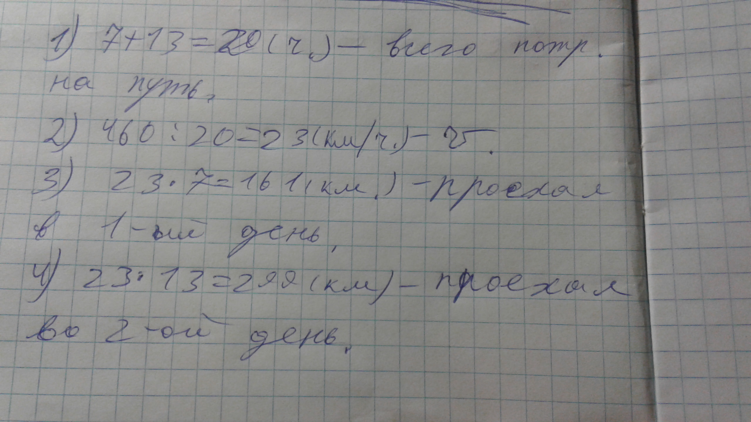 Теплоход за два дня прошёл 460 км. В первый день он был в пути 7 часов, а во второй день 13 часов. Какой расстояние прошёл теплоход в каждый из этих дней, если всё это время шёл с одинаковой скоростью?