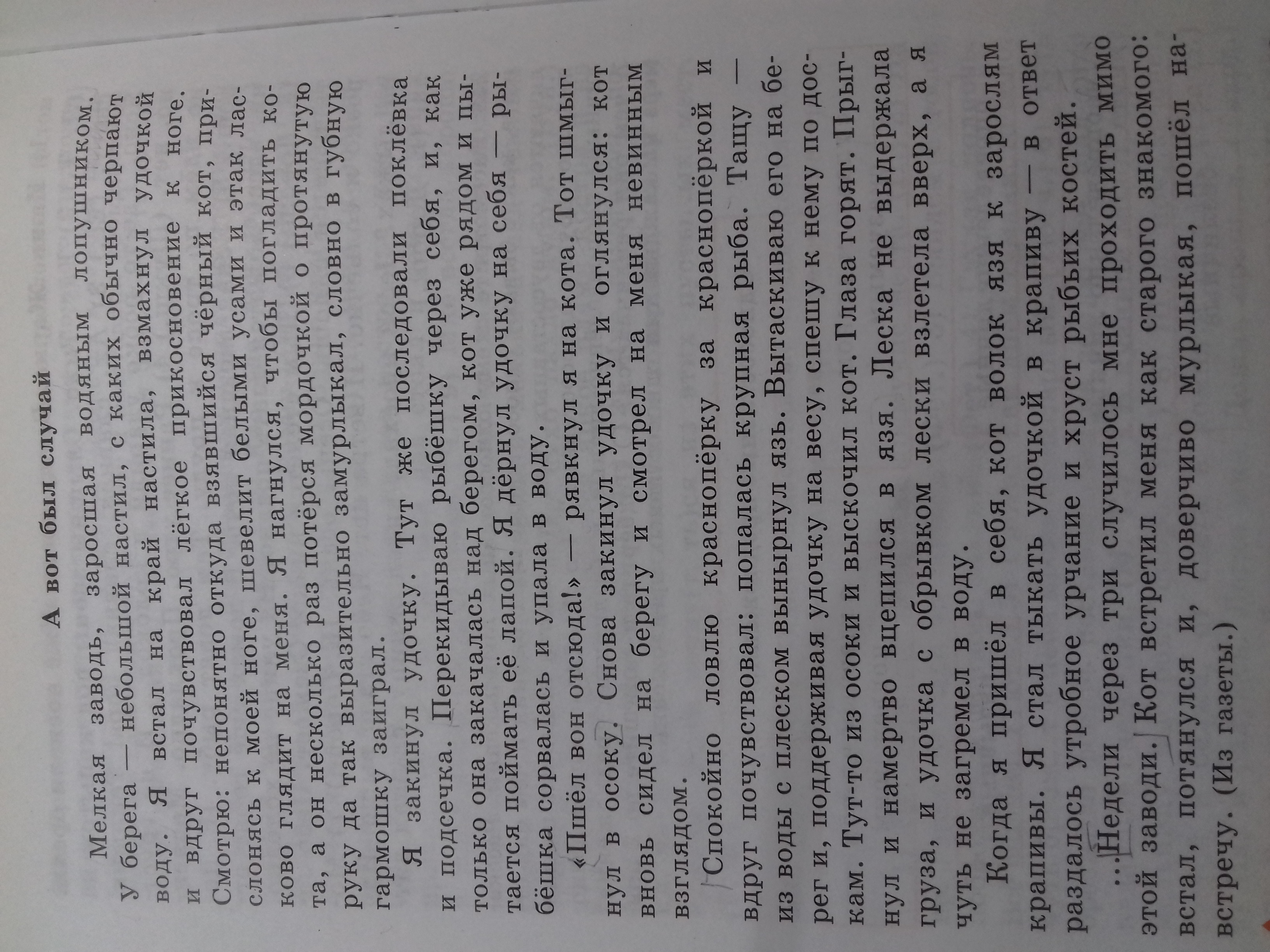 Мелкая заводь, заросшая водяным лопушником. Я встал на край небольшое настила, взмахнул удочкой. Неизвестно откуда взявшийся кот прикоснулся к моей ноге и пошевелил усами. Я захотел по гладить его, и он потерся мордочкой о протянутую руку и громко замурлыкал. Закинул удочку. Сразу же последовали поклевка и подсечка. Как только перекинул рыбу через себя, кот попытался поймать её. Рыбешка сорвалась и упала в воду. "Вон",- крикнул я коту. Он убежал в кусты. Закинул удочку ещё раз и оглянулся. Кот смотрел на меня невинными глазами. Я поймал несколько красноперок и вдруг почувствовал: попалась крупная рыба. Из воды вынырнул язь. Вытащил его на берег и поспешил к нему по доскам. Тут-то из кустов выбежал кот, прыгнул и намертво вцепился в язя. Леска не выдержала, и удочка взлетела вверх, а я чуть не упал в воду. Кот поволок язя к зарослям. Я потыкал удочкой в крапиву, раздалось урчание и хруст рыбьих костей. ...Недели через три я проходил мимо этой заводи. Кот встретил меня как старого знакомого.