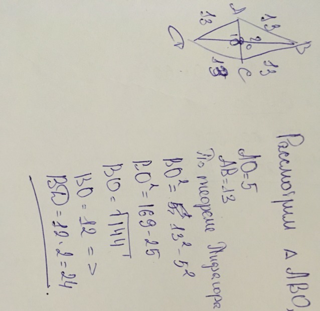 Получаем 13²=5²+b²,отсюда b=12, тогда вся вторая диагональ равна 12*2=24см