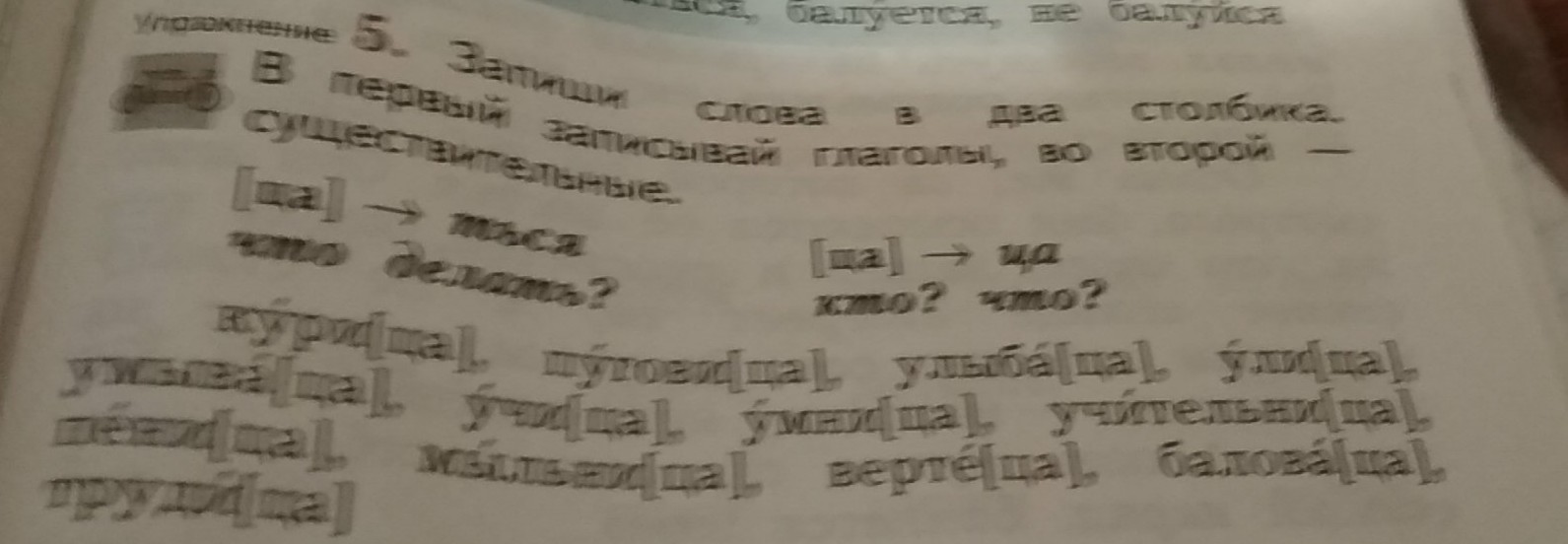 Глагол:улыбаться, умываться, учиться, пенится, вертется, баловаться, трудиться