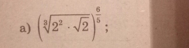 displaystylebigg(sqrt[3]{2^2cdotsqrt2}}bigg)^{frac{6}5}=(2^2cdot2^frac{1}2)^{frac{6}5cdotfrac{1}3}=(2^{2+frac{1}2})^{frac{2}5}=2^{frac{5}2cdotfrac{2}5}=2^1=boxed{2}