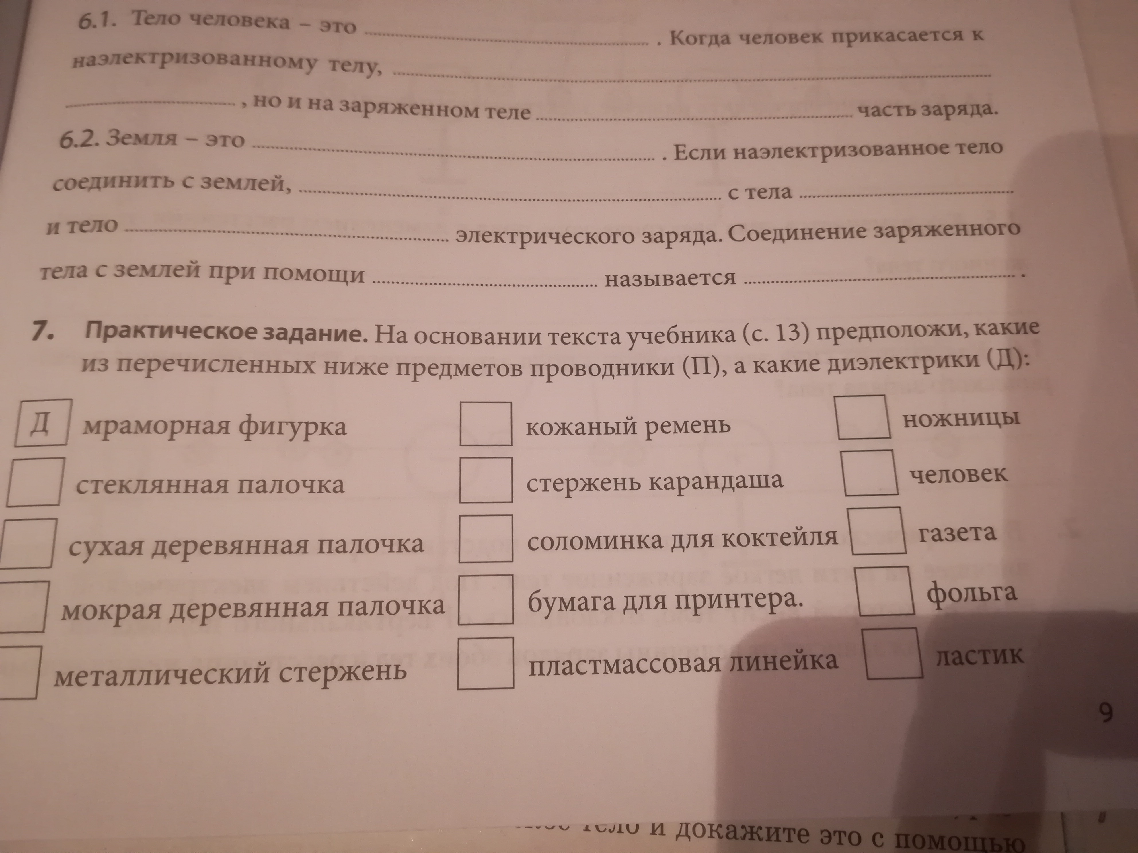 Какие предметы проводники (П), а какие диэлектрики (Д)?