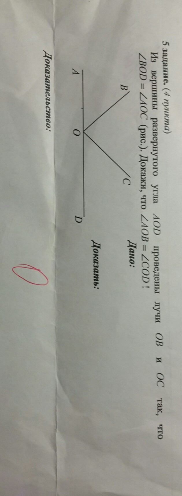 из вершины развёрнутого угла АОВ проведены лучи ОВ и ОС так, что угол ВОД = углу АОС(рис.). Докажи что угол АОБ = углу СОД !