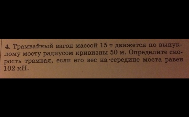 Цетнростремительное ускорение направлено вниз к центру окружности. В проекции на ось ОУ, направленную вниз имеем по формуле mg-N=ma, N=mg-ma= mg-mv²/R. Так как N=P, то mg-mv²/R=P .mv²/R=mg-P. v²=R(mg-P)/m. v=√(R(mg-P)/m); v=√(50(142500-102000)/15000) = √150=12,2 м/с.