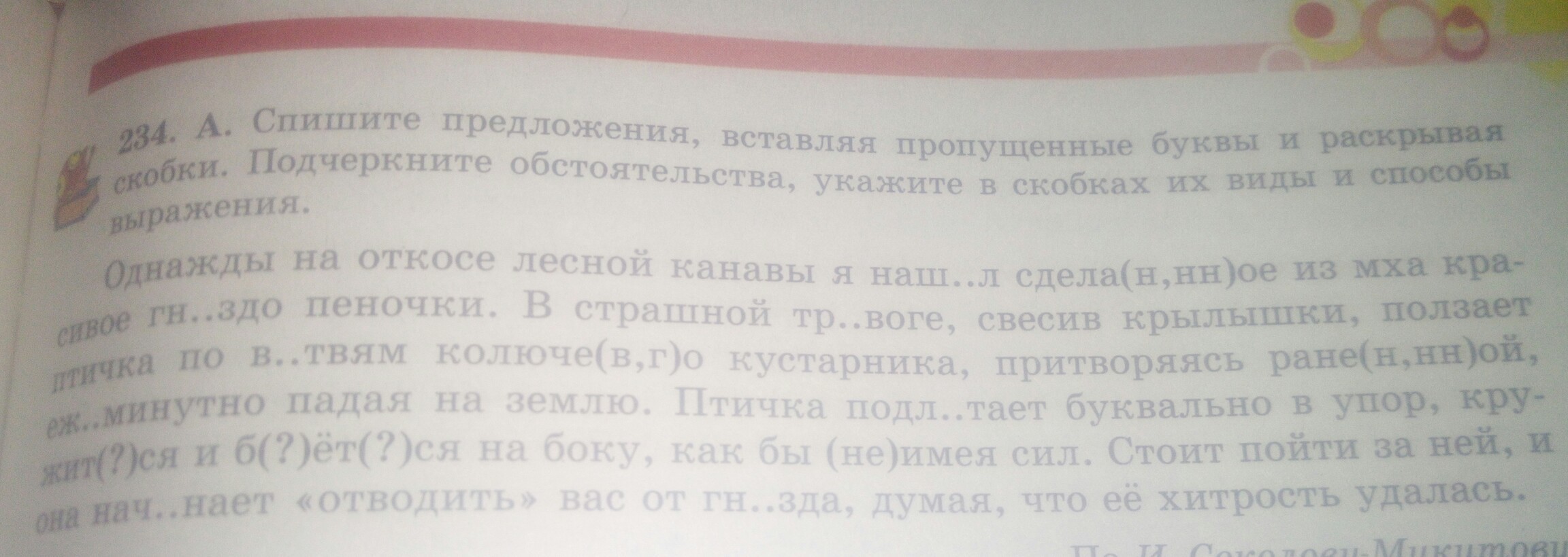 Однажды на откосе(об. места) лесной канавы я нашел сделанное из мха красивое гнездо пеночки. В страшной тревоге, свесив крылышки, ползает птичка по ветвям(об. места) колючего кустарника, притворяясь раненой, ежеминутно(об. действия) падая на землю(об. места). Птичка подлетает буквально в упор(об. действия), кружится и бьется на боку(об. места), как бы не имея сил. Стоит пойти за ней(об. места), и она начинает "отводить" вас от гнезда(об. места), думая, что ее хитрость удалась.