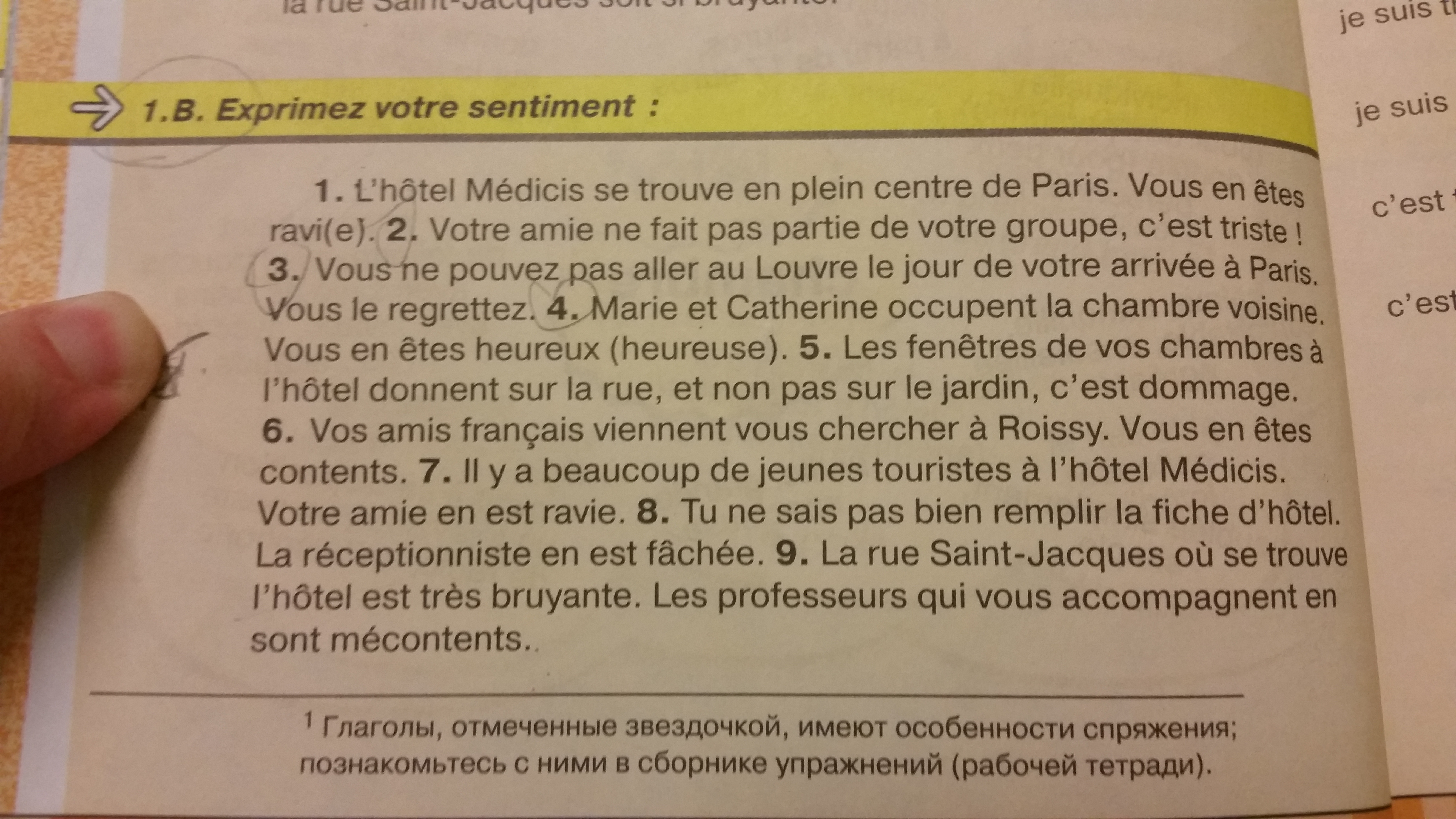 1. Отель Medici находится в центре Парижа. Вы в восторге. 2. Ваш друг не входит в вашу группу, это печально. 3. Вы не можете отправиться в Лувр в тот день, когда вы приедете в Париж. вы сожалеете об этом. 4. Мария и Кэтрин занимают следующую комнату. Вы счастливы. 5. Окна ваших номеров в отеле выходят на улицу, а не в сад, это позор. 6. Ваши французские друзья приедут за вами в Руасси. Вы счастливы. 7. В отеле Medici много молодых туристов. Ваш друг в восторге. 8. Вы не знаете, как заполнить лист отеля. Регистратор сердится. 9. На улице Сент-Жак, где расположен отель, очень шумно. Учителя, которые сопровождают вас в 8, недовольны.