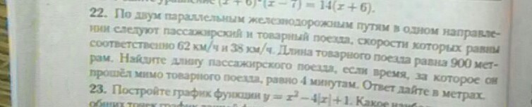 по двум параллельным железнодорожным путям в одном направлении соответственно 62 км/ч и 38 км/ч. длина товарного поезда равна 900 метрам. найдите длину пассажирского поезда если время за которое он прошел мимо товарного поезда равно 4 минутам. ответ дайте в метрах