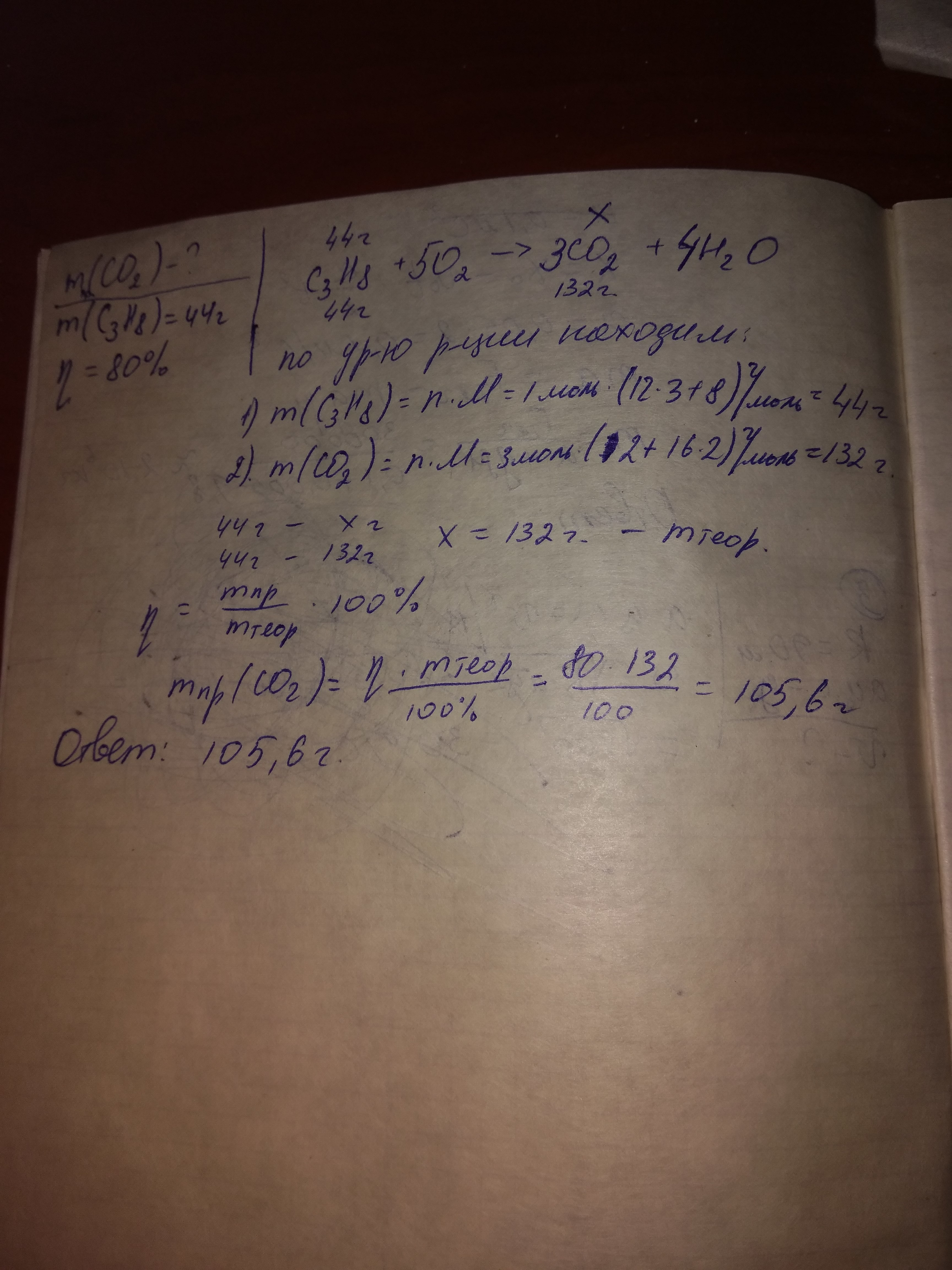 вычислите массу углекислого газа которая образуется при горении 44 г пропана если выход продукта составляет 80%