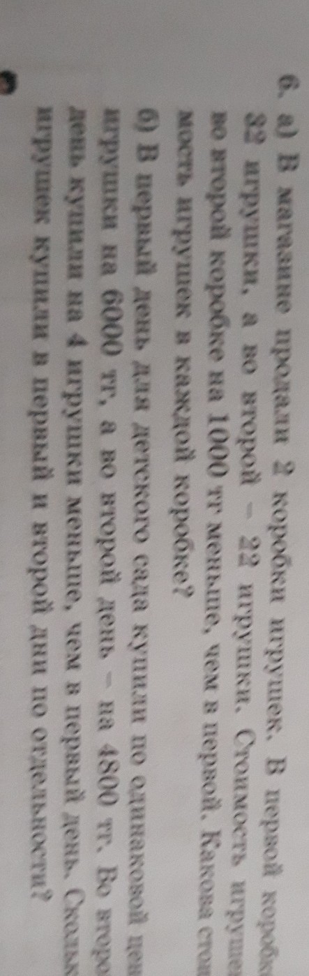 в магазине продали 2 коробки игрушек в первой коробке 32 игрушки а во второй 22 стоимость игрушек во второй коробке на 1000 тенге меньше чем в 1 Какова стоимость игрушек в каждой коробке