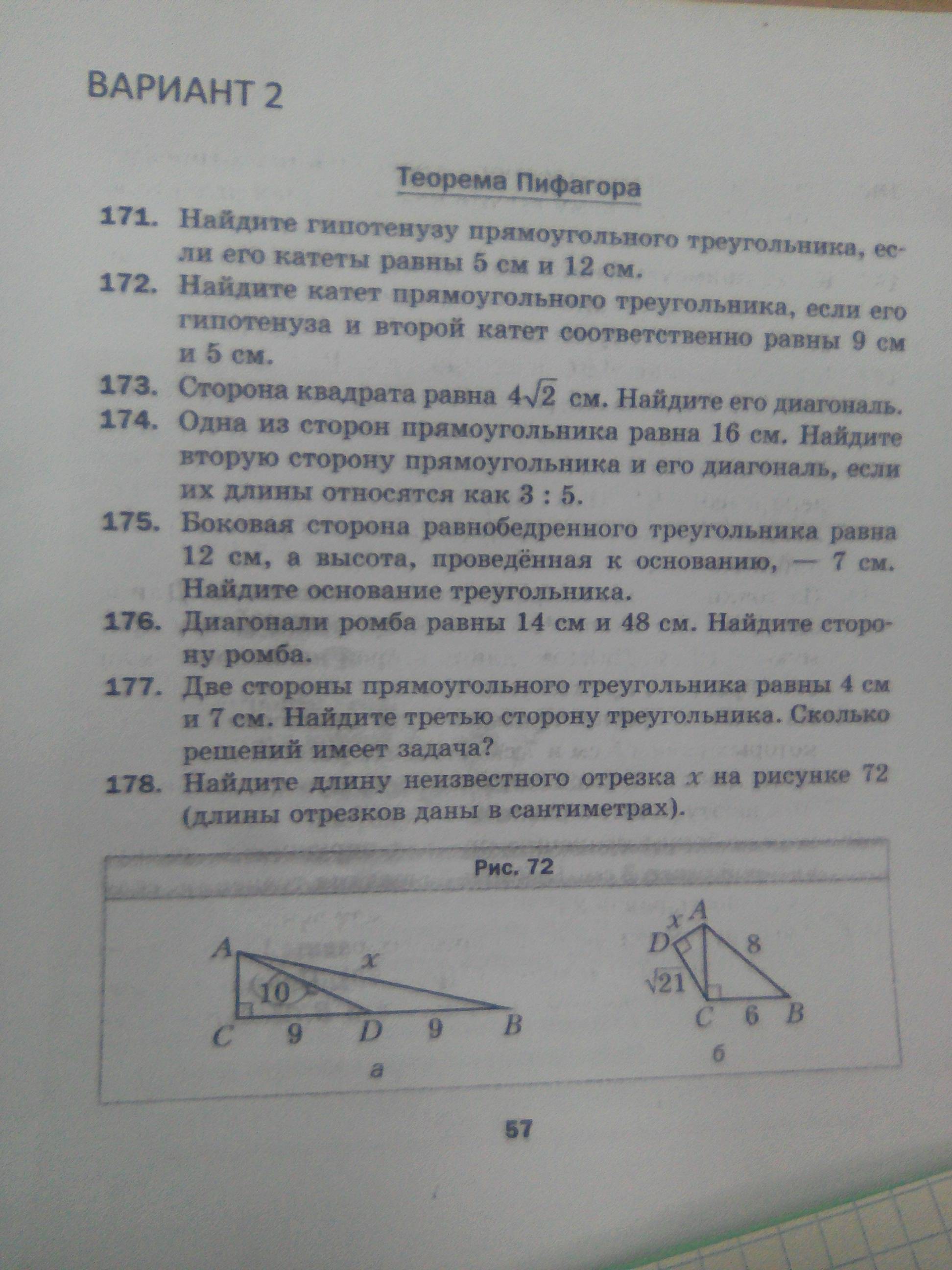 Это задачи в одно действие, там всё сходится к трём переменным: a и b - катеты, с- гипотенуза прямоугольного треугольника. Далее только лишь подставляется в общую формулу Теоремы Пифагора. Для 174 нужно написать, что две ст. и диагональ прямоуг. - прямоуг тр.