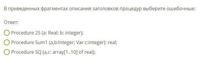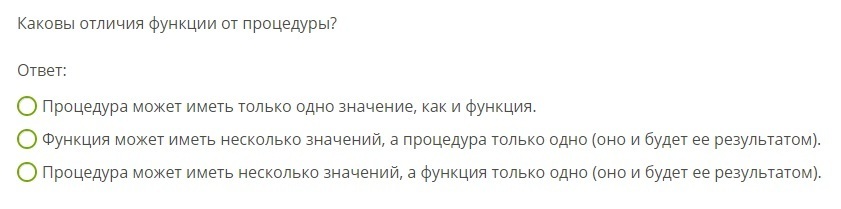 2) Процедура может иметь(возвращать) несколько значений, а функция только одно(оно и будет ее результатом).