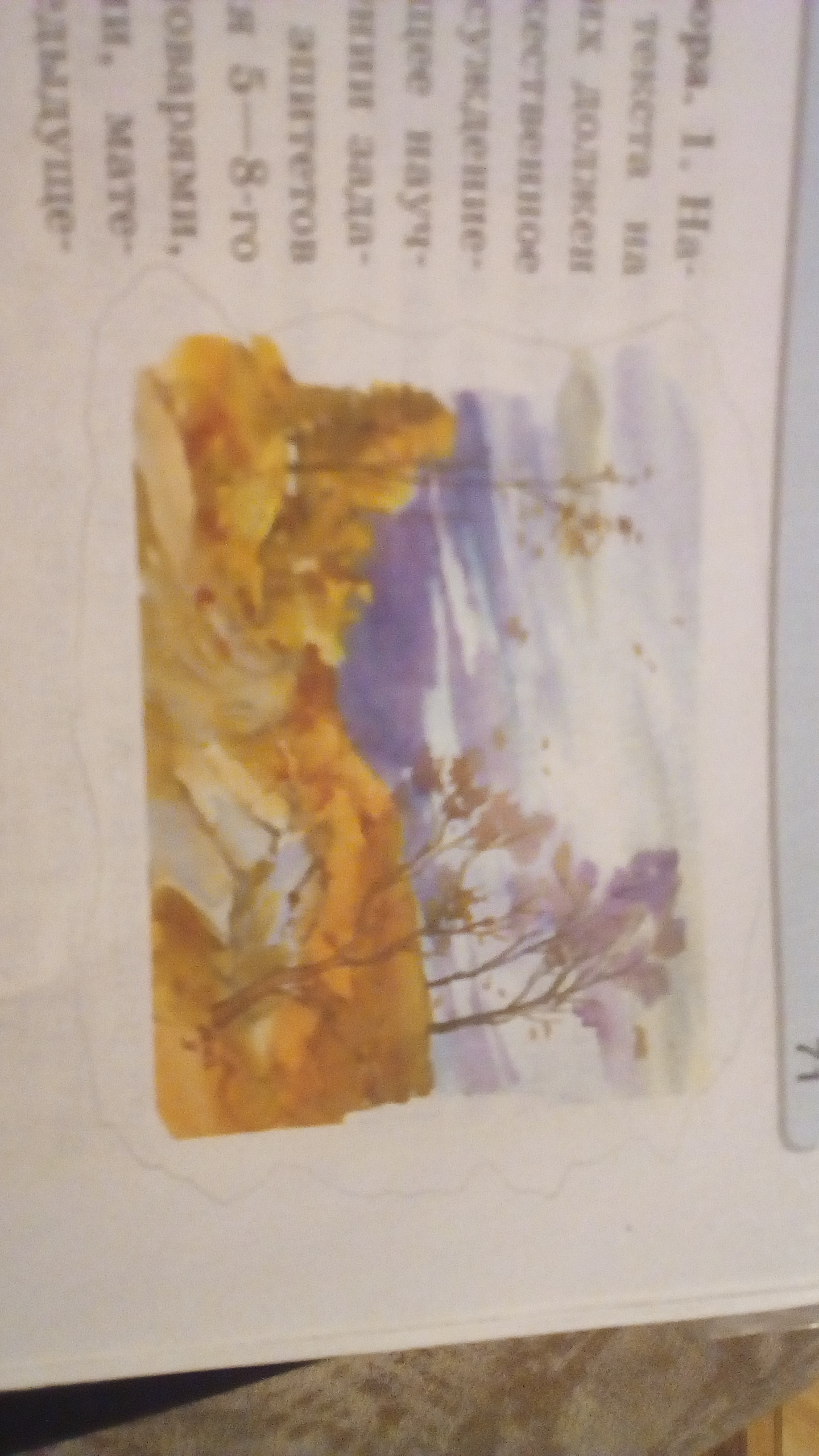на фотографии я вижу пейзаж. с права изображено дерево, на которое дует ветер. слева изображены золотые деревья. картина описывает осень. в ней использованы теплые и холодные цвета. на небе фиолетовые тучи, а на поверхности земли осенние деревья.