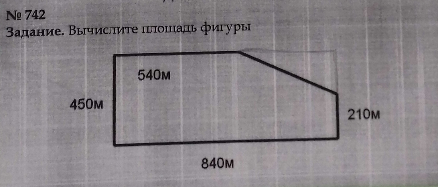 Sтреугольника=(300*240)м/2=36000 так как треугольник составляет половину прямоугольника, теперь вычисляешь полный прямоугольник (450*840)м=378000м Sфигуры=Sполного прямоугольника-Sтреугольника=(378000-36000)м=342000м Ответ : S фигуры=342000м .