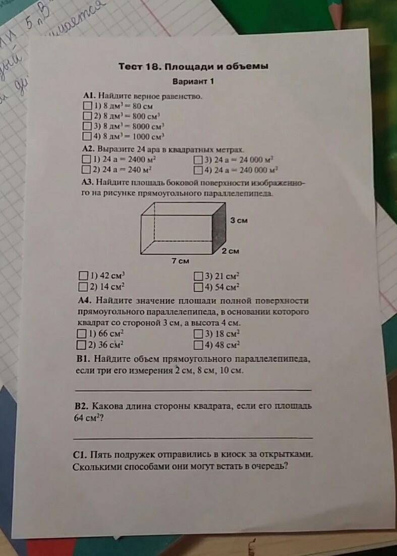 Помогите пж с объяснением очень срочнодам максимум 35 баллов ТЕСТ 18.ПЛОЩАДИ И ОБЪЁМЫВЕСЬ ПОЖАЛУЙСТА ДОБРЫЕ ЛЮДИ!!!