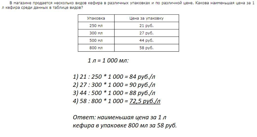 В магазинах продается несколько видов кефира в различных упаковках и по различной цене какова наименьшая цена за 1 литр кефира среди данных таблицы видов.