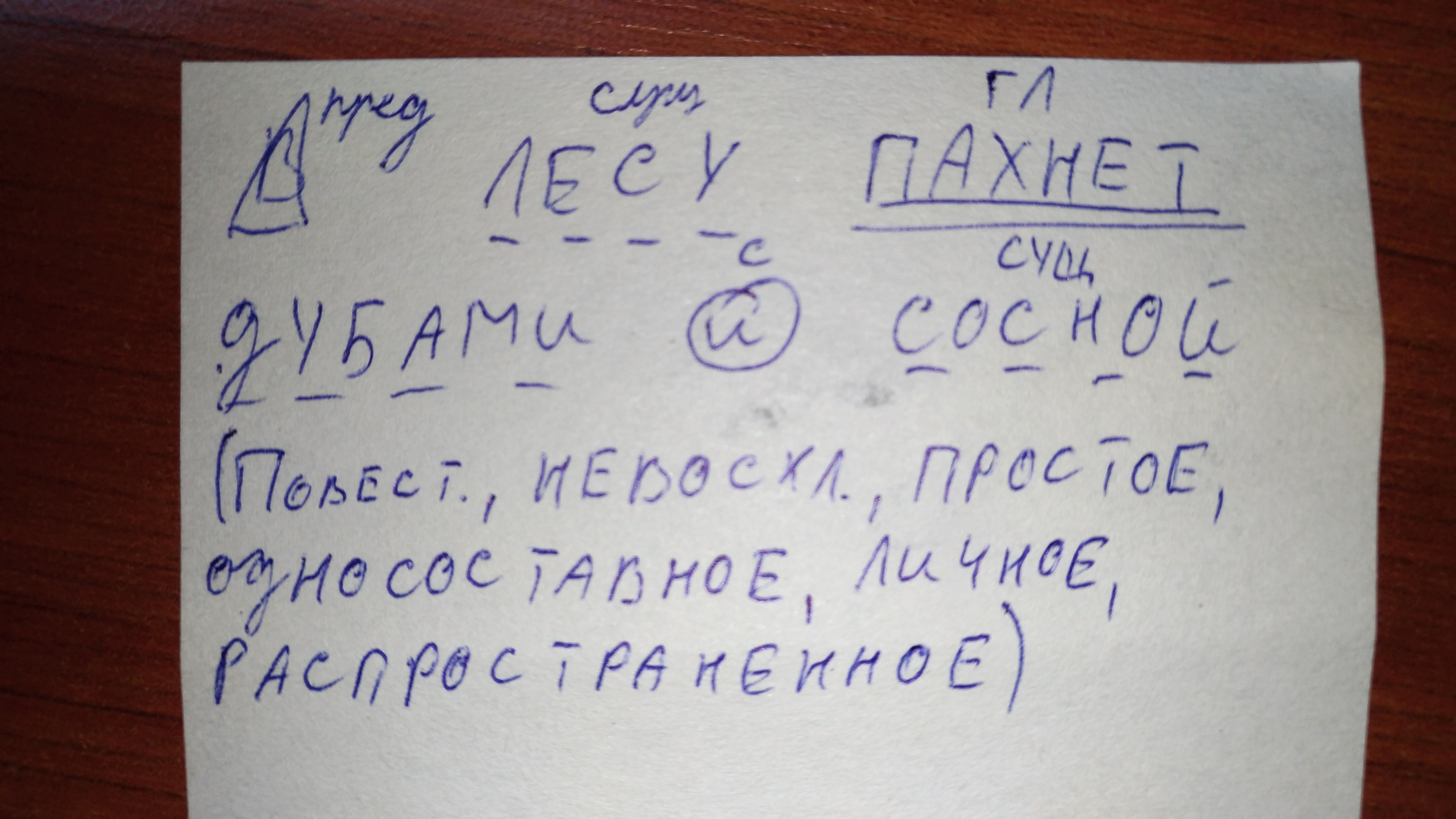 В лесу(обстоятельство) пахнет(сказуемое) дубами(дополнение) и(союз) сосной(дополнение).Это повест.,невоскл. простое односоставное распространённое предложение с однородными дополнениями.