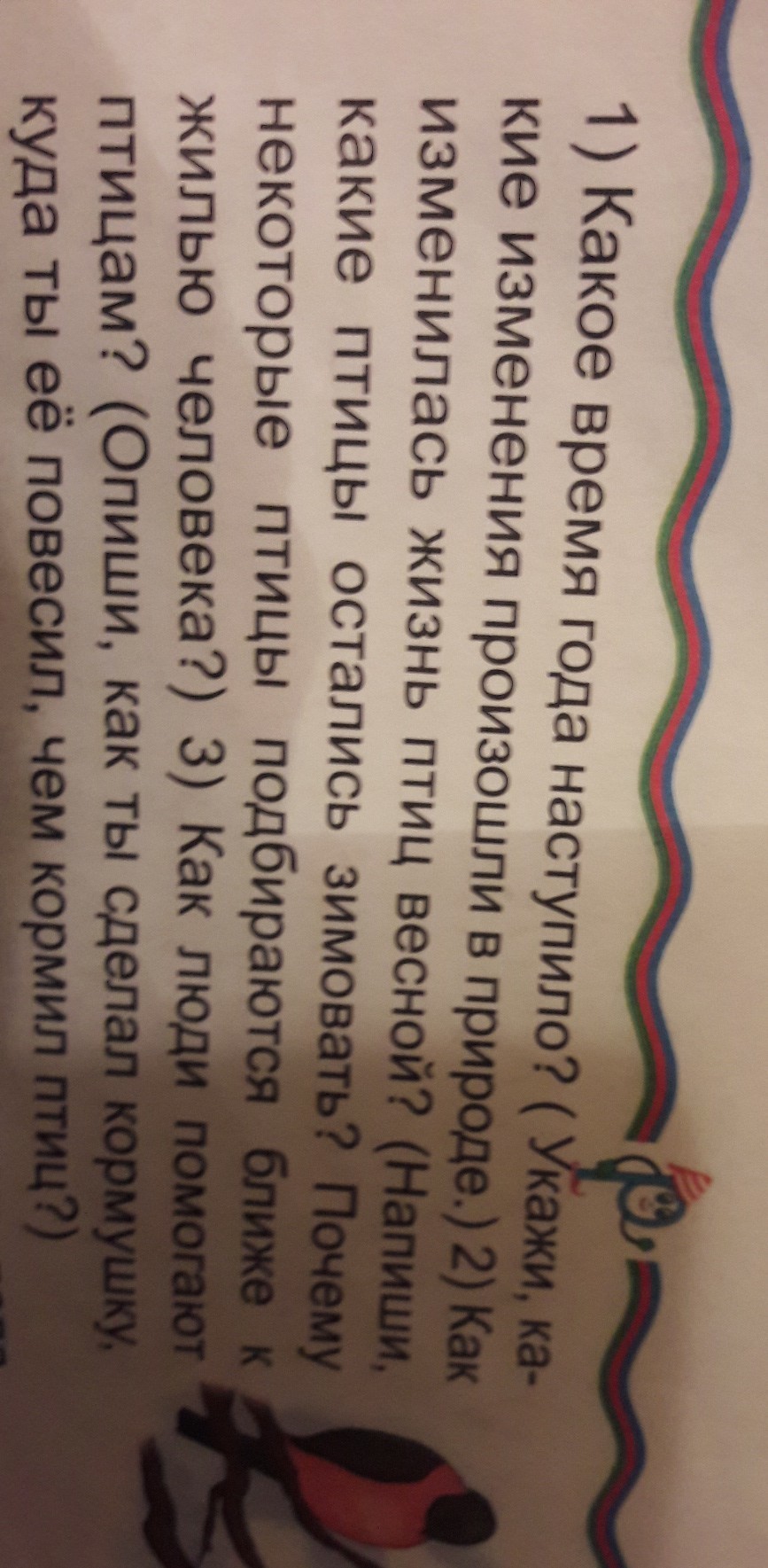 Наступила холодная зима . На улицах сильный мороз.Все белеет.Дорога покрыта снегом , словно ковром . Птицы улетают на юг , в тёплые края .Но есть птицы, которые остаются зимовать , например : голуби , вороны , ласточки , вОроны .Некоторые птицы подбираются ближе к жилью человека ,потому ,что им нужно тепло .Птицам приходится нелегко зимой , и чтобы помочь им пережить это время , люди строят кормушки для птиц и вешают их на деревья. Нужно не забывать покормить птиц , например : крошками хлеба , семенами и т.д.