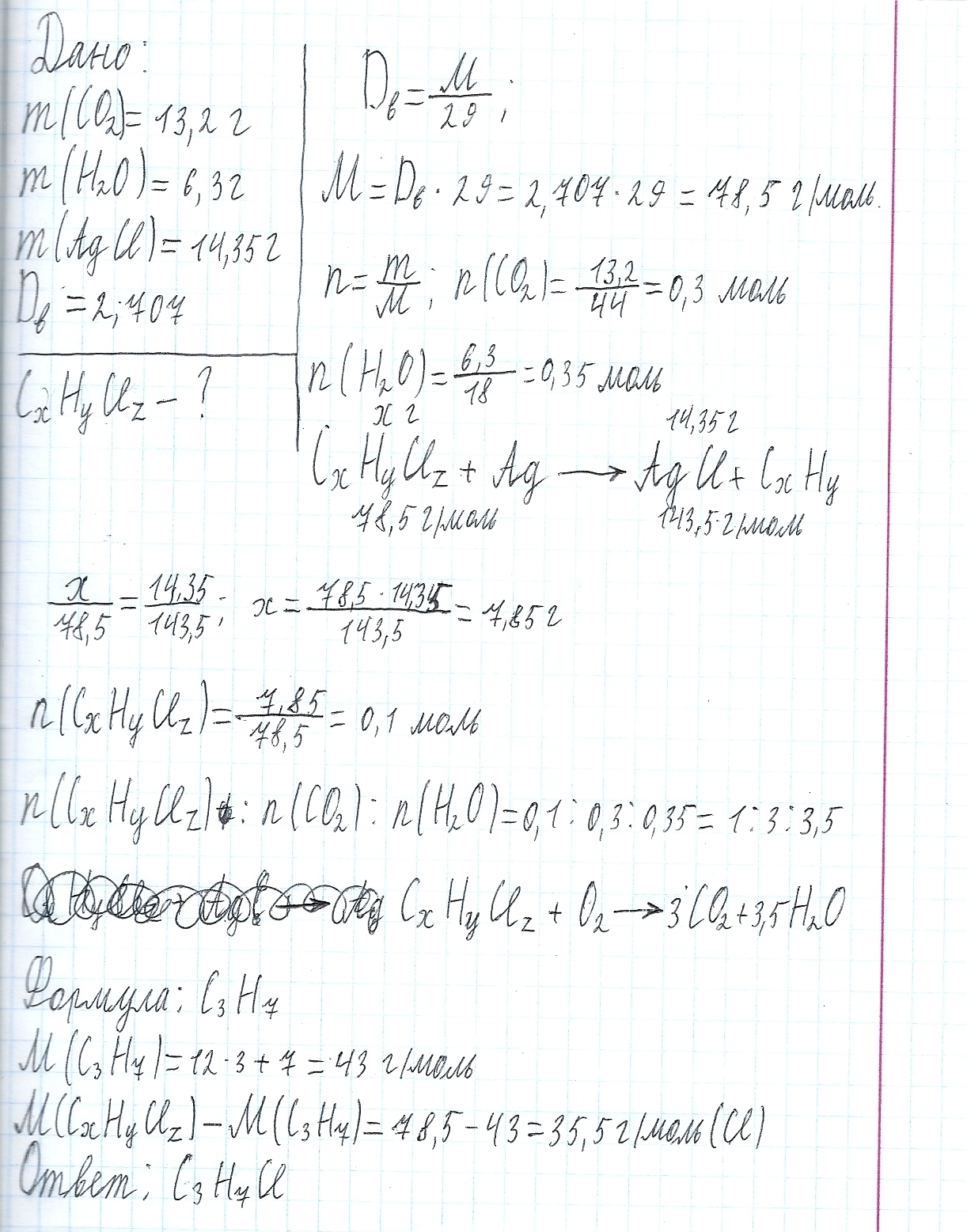 При сожжении вещества, содержащего углерод, водород и хлор, было получено CO2 массой 13,2 г и H2O массой 6,3 г. При определении хлора из такой же навески получен хлорид серебра массой 14,35 г. Определите формулу вещества, если плотность его паров по воздуху равна 2,707
