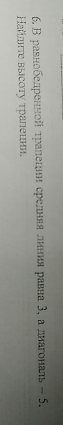 Если нужно быстро прикинуть ответ, представьте себе прямоугольник с диагональю 5, средняя линия равна горизонтальным сторонам, найти другую пару сторон (высоту). По теореме Пифагора: h= √(25-9) =4