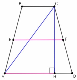 В равнобедренной трапеции высота из вершины делит большее основание на отрезки, равные полусумме и полуразности оснований. Полусумма оснований = средняя линия, AH=EF. Таким образом, в равнобедренной трапеции диагональ, высота и средняя линия связаны теоремой Пифагора: d^2= h^2 +m^2