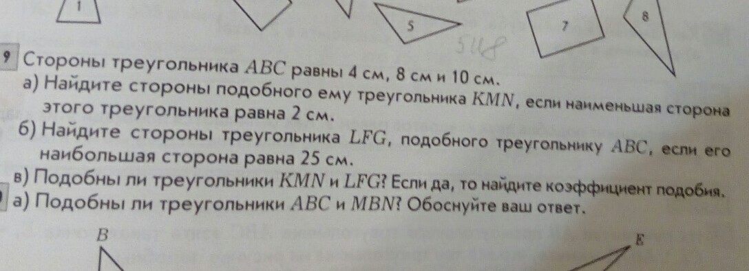коэффициент подбор равен сторона/соответствующая сторона. в треугольнике АВС большая сторона 10, в LFG 25. Значит коэффициент подобия равен 25/10=2.5 и в треугольнике LFG каждая сторона больше стороны треугольника АВС в 2.5 раз. значит у него стороны 10 20 25