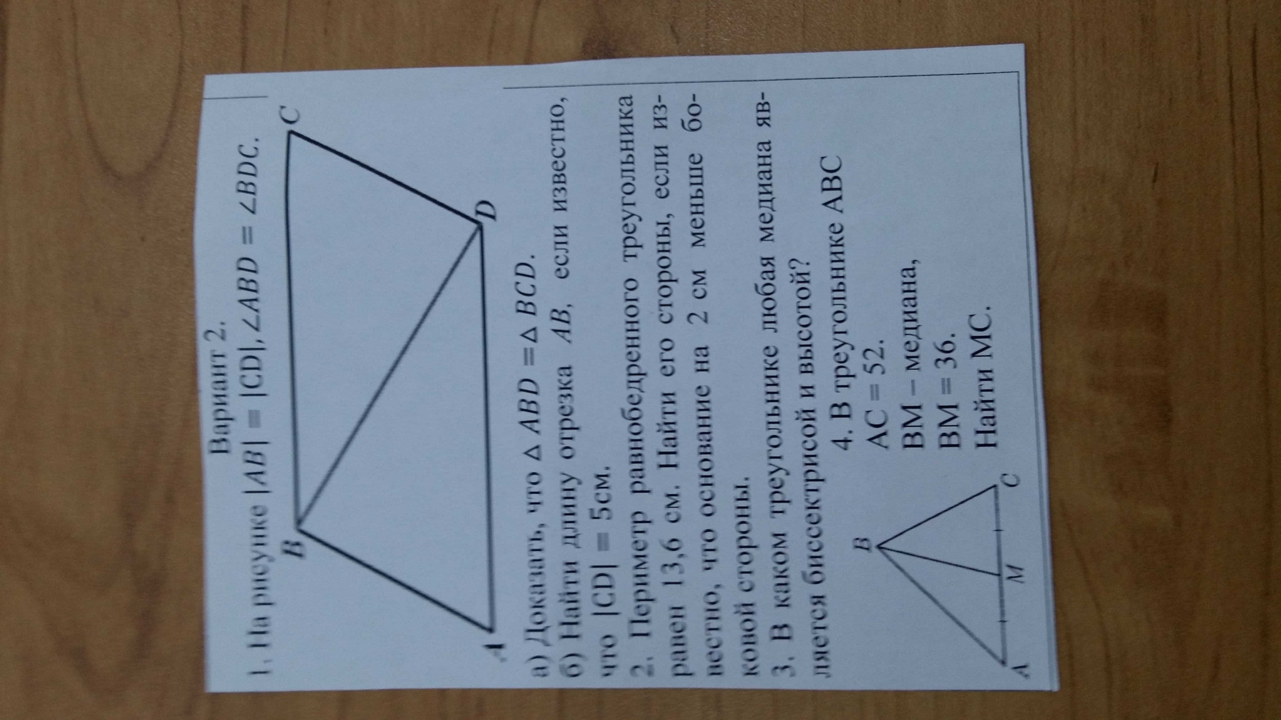 если ав=сд и углы раны в условии то вд общяя и треугольники равны по 1 признаку равенства треуг.