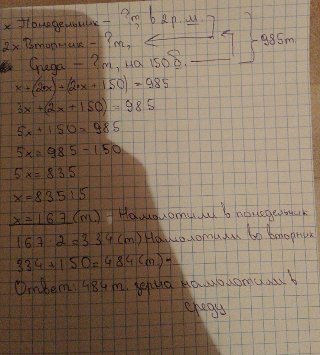 В понедельник намолотили в 2 раза меньше зерна, чем во вторник. А в среду на 150 т. больше, чем во вторник. Сколько тонн зерна намолотили в среду, если за три дня уборки собрали 985 т зерна. Решите с Х