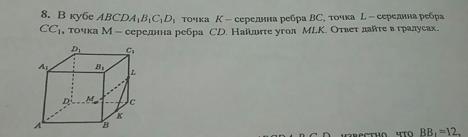 В кубе точки K,L,M середины соседних рёбер ,а это значит ,что длины этих отрезков KL,KM,LM ,будут равны между собой ,так если в треугольнике все стороны равны ,то это равносторонний треугольник ,а значит все углы равны ⇒ ∠MLK=60°