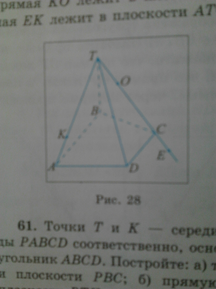 TABCD-четырехугольная пирамида, K принадлежит AT, O принадлежит TC, E принадлежит TC. а) Назовите прямые,по которым пересекаются плоскости ATB и TBC,TBE и TDC.б)докажите,что прямая КО лежит в плоскости АТС.в) верно ли,что прямая ЕК лежит в плоскости АТС?
