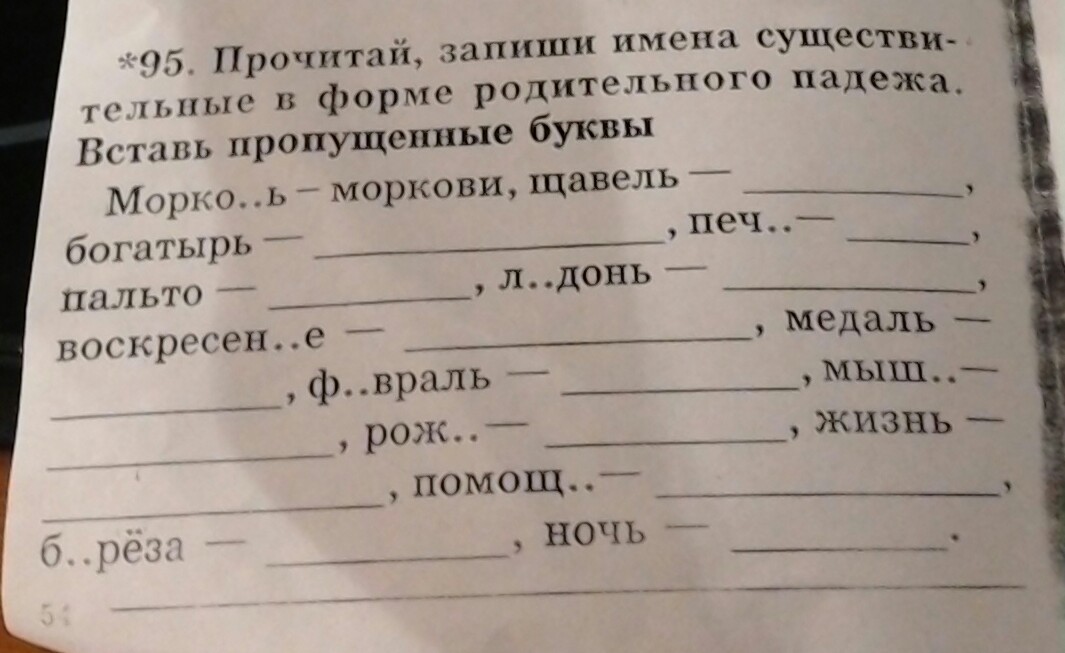 Морковь-моркови, щавель-щавеля, богатырь-богатыря, печь-печи, пальто-пальто, ладонь-ладони, воскресенье-воскресенья, медаль-медали, февраль-февраля, мышь-мыши, рожь-ржи, жизнь-жизни, помощь-помощи, береза-березы, ночь-ночи.