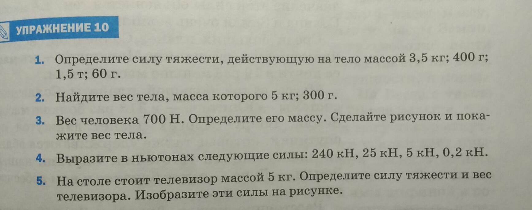 2.Вес тела: P = m · gгде g = 9,8 м/с² ≈ 10 м/с² - ускорение свободного падения; Вес тела массой 5 кг: P = 5 · 10 = 50 (H)массой 300 г = 0,3 кг: P = 0,3 · 10 = 3 (H)