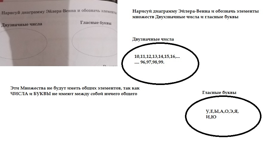 Нарисуй диаграмму Эйлера-Венна и обозначь элементы множеств Двухзначные числа и главные буквы